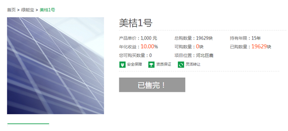 SPI陽光動(dòng)力能源互聯(lián)網(wǎng)公司發(fā)布的實(shí)物融資租賃類產(chǎn)品“綠能寶”,剛剛上市,其產(chǎn)品“美桔1號(hào)”剛上市就被消費(fèi)者瘋搶一空,高達(dá)10%的固年化收益——“高收益,”快速靈活兌現(xiàn)——“很靈活”,使得19629塊太陽能發(fā)電板一天之內(nèi)全部售光,瞬間秒殺了余額寶等理財(cái)產(chǎn)品。