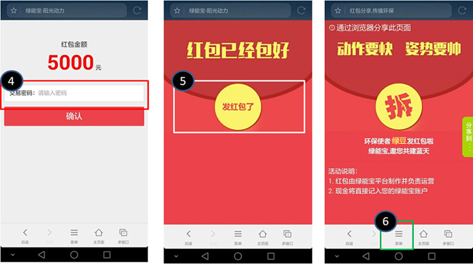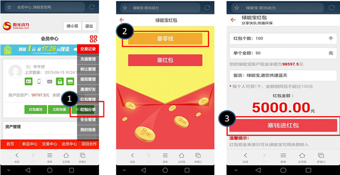 2015年6月15日,綠能寶“紅包分享,傳播環(huán)保”功能正式上線,“紅包分享,傳播環(huán)?!笔轻槍?duì)手機(jī)用戶的紅包分享功能,用戶可以將自己綠能寶可用余額中的現(xiàn)金通過(guò)綠能寶紅包分享給自己的好友,好友得到紅包的金額將直接計(jì)入綠能寶賬戶余額。