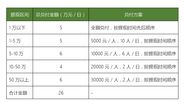 小額工作日持續(xù)兌付,每天的兌付額度將保證26萬持續(xù)兌付,具體分配比例如下: