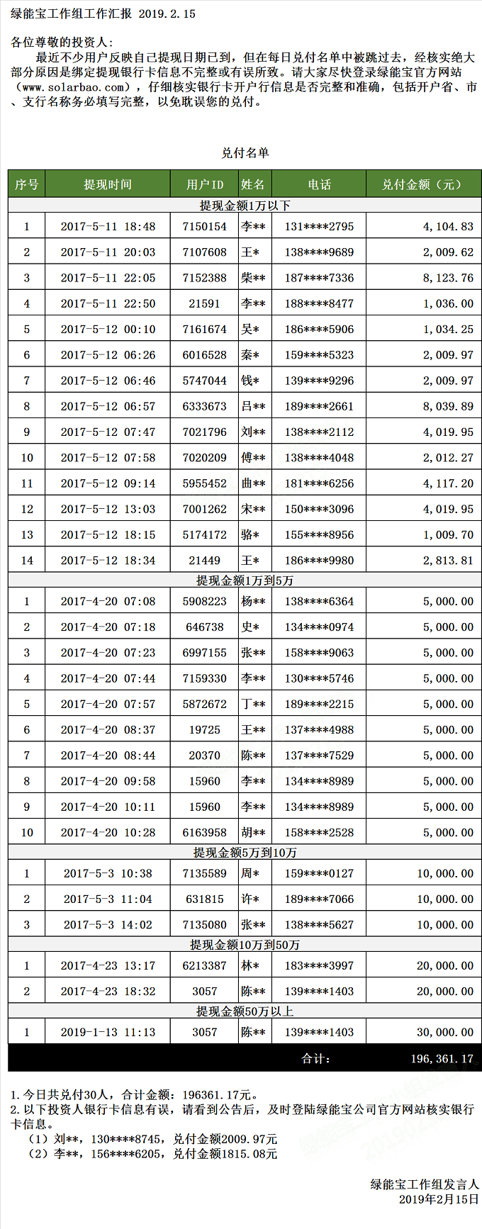 兌付名單(2019年2月15日)