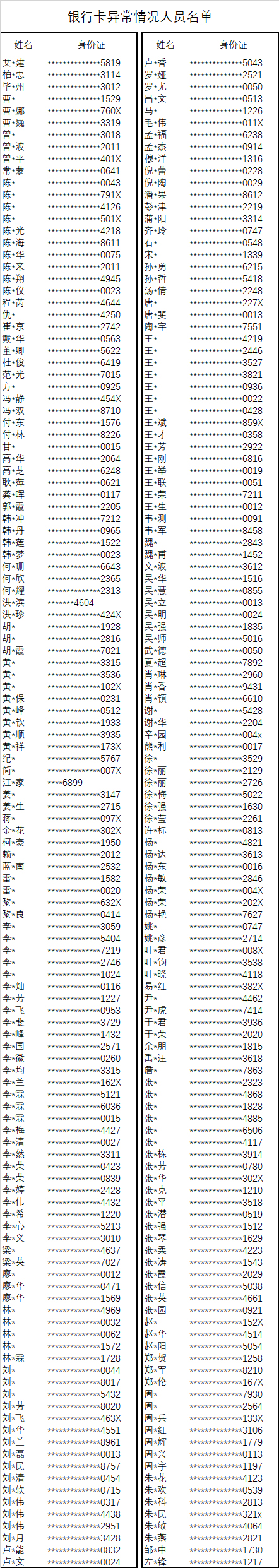 涉及銀行卡異常兌付款轉賬失敗人員名單: