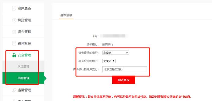 部分投資人由于銀行卡信息缺失原因,無法正常接受兌付款。銀行卡信息缺失情況包括:缺少開戶行名稱、缺少開戶行省、市信息等。請涉及此類情況投資人在2023年12月7日前,盡快登陸綠能寶官網(wǎng),補(bǔ)充開戶行信息(省、市、開戶行名稱必須完整)。具體操作見下圖: